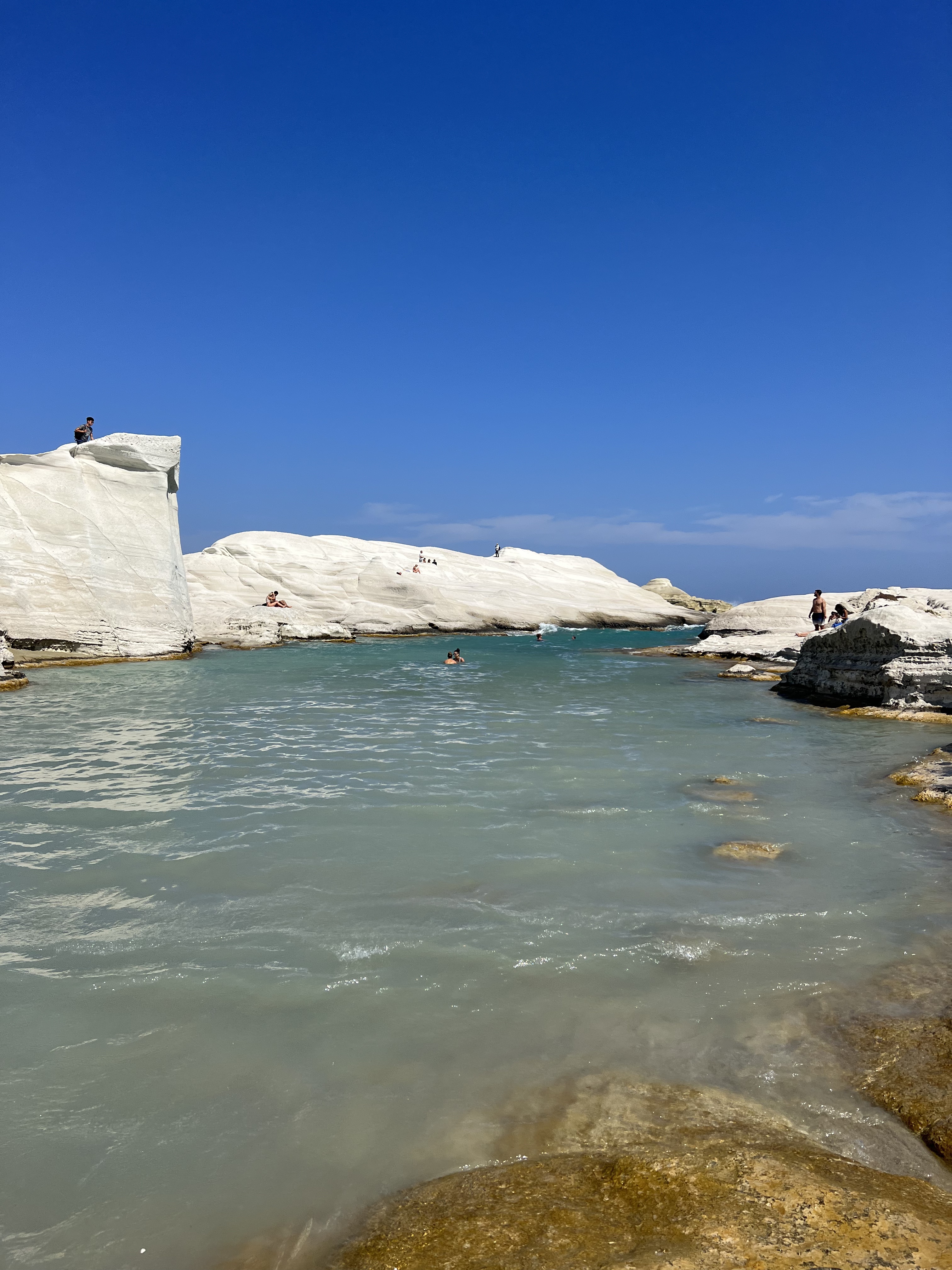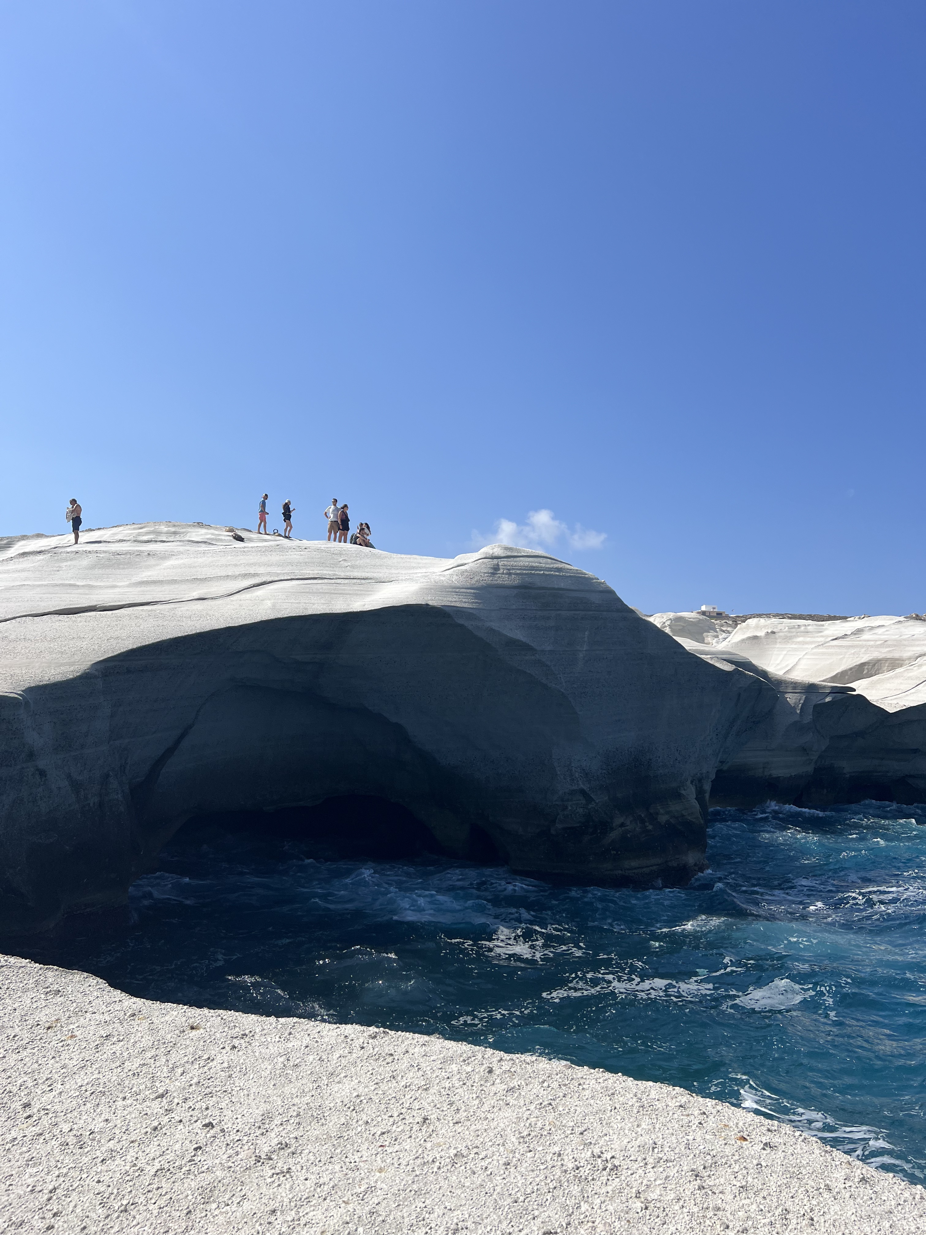 Tsigrado Beach (below), one of Milos’ most secluded gems, is a hidden cove surrounded by towering volcanic cliffs, accessible only by a steep ladder and rope descent. Its soft white sands and crystal-clear waters are shaped by the island’s volcanic past, creating a striking contrast between rugged rock formations and the serene Aegean Sea. However, like many coastal areas, Tsigrado is vulnerable to erosion and rising sea levels, with climate change threatening the delicate balance of its cliffs and shoreline. Sustainable tourism and conservation efforts are key to preserving this untouched paradise.